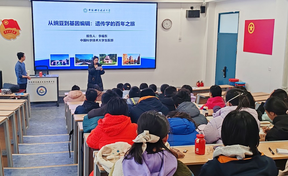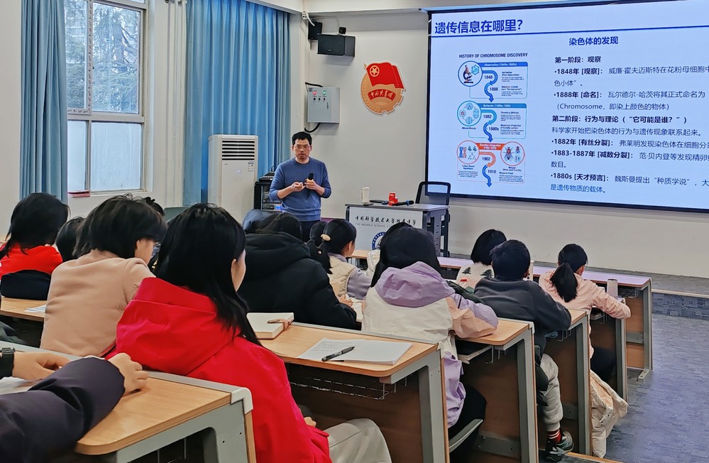讲座中,李教授以时间为脉络,从150多年前孟德尔的豌豆实验切入,带领同学们重温遗传学史上的高光时刻,逐步深入解析遗传密码的奥秘。从基础的性状传递规律到前沿的基因编辑技术突破,他用通俗易懂的语言将复杂的分子机制、精准的识别规律转化为生动的科学知识,既展现了遗传学跨越百年的发展历程,也呈现了该领域的前沿动态与应用价值。