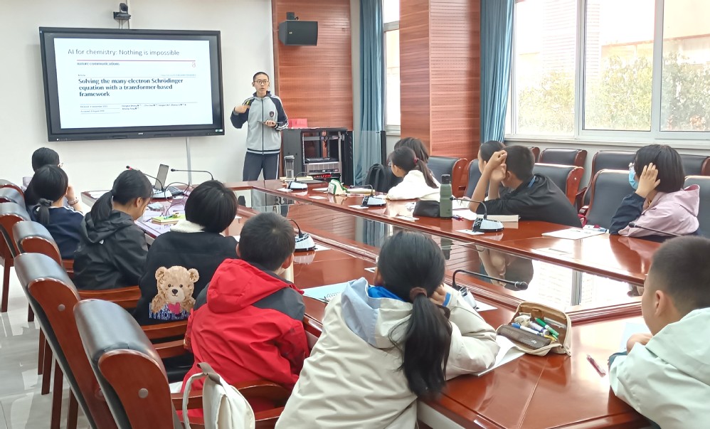 线下指导环节,中国科学技术大学少年班在读学长刘明皓亲临现场。他结合自身化学探索经历,拆解各阶段学习重点,展示趣味化学实验与相关视频,生动展现化学学科魅力。他强调,化学学习要兼顾文科素养与理科思维,践行“红专并进,理实交融”,鼓励同学们互助共进、潜心钻研。
