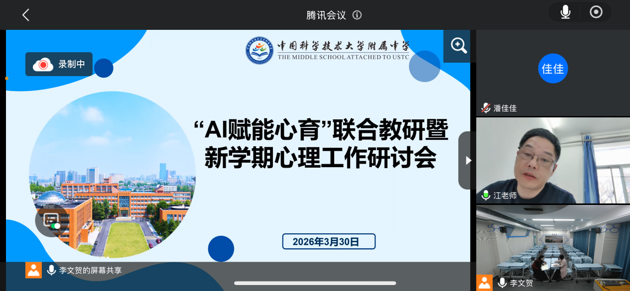 为深化校际合作,促进心理健康教育教师专业成长,提升心理课堂教学质量与学校心理工作伦理素养,3月30日上午,我校与中科大附中实验学校、中国科大附中高新中学及蚌埠市吴安小学共同举办“AI赋能心育”联合教研暨新学期心理工作研讨会。