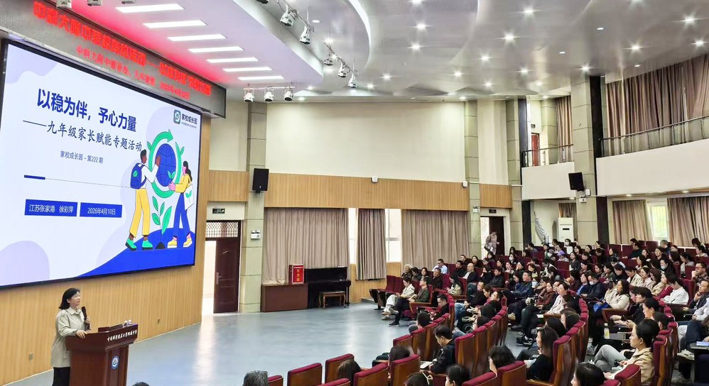 4月10日下午,我校第38期“家校有约”——九年级家长赋能专题活动在报告厅开展。本次活动特邀江苏省张家港市家校成长园专家徐彩萍老师作《以稳为伴,予心力量》专题报告,副校长黄乃斌、德育处副主任朱浩、九年级全体学生家长及班主任参加活动,活动由年级组长魏丽云主持。
